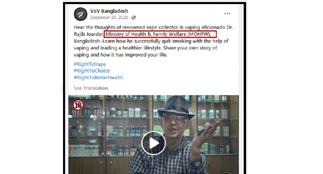 নিজেকে স্বাস্থ্য ও পরিবার কল্যাণ মন্ত্রণালয়ের কর্মকর্তা (পদস্থ: সার্জারি বিভাগ, ঢাকা মেডিকেল কলেজ) দাবি করে ডা. রাজিব জোয়ার্দার নামের জনৈক ব্যক্তি একটি ফেসবুক পেইজের প্রকাশিত ভিডিওতে ভেপিংয়ের সমর্থনে জোর প্রচারণা চালিয়েছে। ...