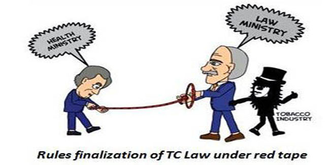 ‘ধূমপান ও তামাকজাত দ্রব্যের ব্যবহার (নিয়ন্ত্রণ) (সংশোধন) আইন-২০১৩’ পাস হয় গত বছরের ২৯শে এপ্রিল। এরপর এটি বাস্তবায়নে প্রয়োজন দেখা দেয় বিধিমালার। তারও খসড়া প্রণয়ন করে সরকার। কাজ শেষ হয় গত বছরের সেপ্টেম্বরে। প্রস্তুতি ছিল নভেম্বরের মধ্যে সেটি চূড়ান্ত করার। এ লক্ষ্যে স্বাস্থ্য মন্ত্রণালয় থেকে সেটা আইন মন্ত্রণালয়ে পাঠানো হয়। কিন্তু বিপত্তি বাধে সেখানেই। একটি ধারায় আপত্তি থাকায় ফাইলটি এখন পর্যন্ত আইন সচিবের টেবিলে আটকে আছে। বিধিমালা প্রণয়নের সঙ্গে সংশ্লিষ্ট ও তামাকবিরোধী সংগঠনের কর্মীরা আইন মন্ত্রণালয়ের ‘গড়িমসি’র কারণে সহসা বিধিমালা আলোর মুখ হয়তো দেখবে না- এমন সংশয় প্রকাশ করেছেন। তারা মনে করেন, বিধিমালা জারি যত দেরি হবে, আইন প্রয়োগ তথা বাস্তবায়নে ততটা বিলম্ব হবে। আর এটিই চাইছে তামাক কোম্পানিগুলো। এ কারণে নীতিমালা হলেও বিধিমালার অভাবে এখন পর্যন্ত অকার্যকর থেকে গেছে তামাক নিয়ন্ত্রণ আইন।