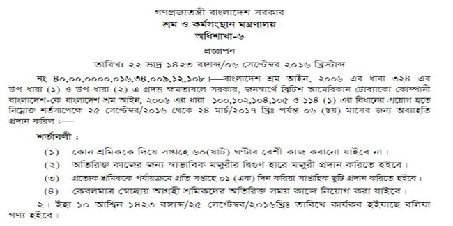 Employees of British American Tobacco can, if they want to, work up to 60 hours a week instead of the current maximum permissible weekly hours of 48, the labour ministry has said.