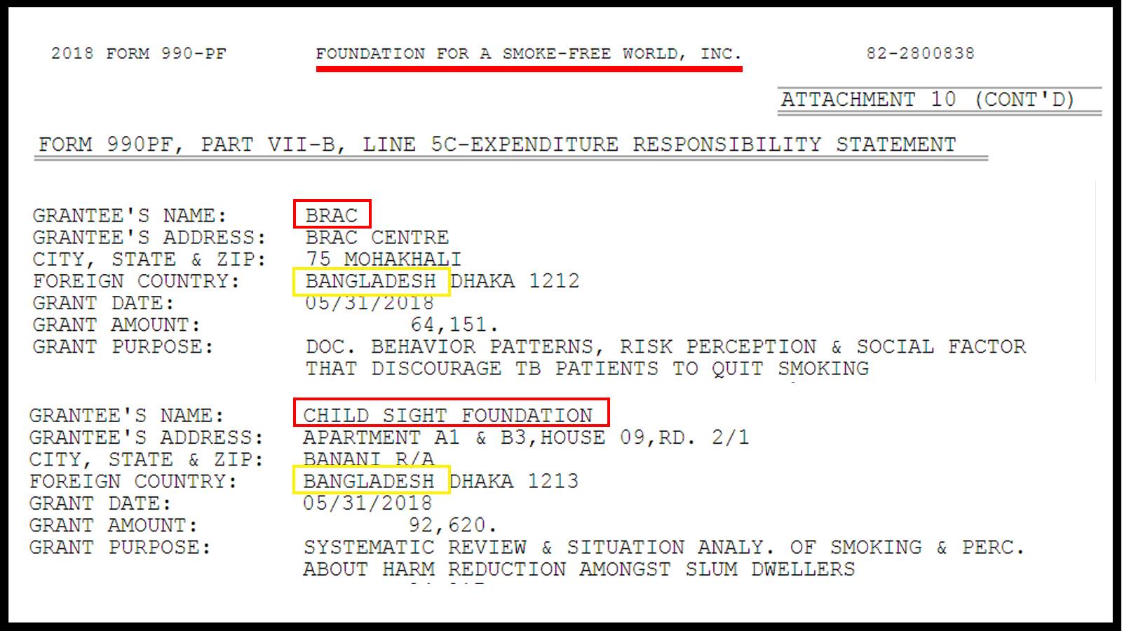In Bangladesh, two organizations namely BRAC and Child Sight Foundation (CFS) received grants worth USD 64,151 and USD 92,620 respectively from the giant multinational tobacco company Philip Morris- Funded “Foundation for a Smoke-Free World (FSFW)”. The BRAC is working for documenting behavior patterns, risk perception & social factor that discourage TB patterns to quit smoking. The CFS is doing systematic review & situation analysis of smoking & perception about harm reduction amongst slum dwellers. The information has recently revealed by TobaccoTactics, a project of the Tobacco Control Research Group at the Department for Health at the University of Bath. The details will be found at: click here