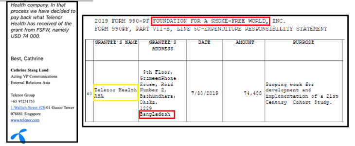 Telenor Health, a digital healthcare service owned by Norway-based Telenor business group, has recently decided to refund the $ 74,400 worth grant received from Foundation for Smoke-Free World (FSFW), a pseudo anti-tobacco organization funded by multinational tobacco giant Philip Morris International (PMI). On May 22, PROGGA sent an alert to Bangladeshi and global public health and anti-tobacco activists on the receipt of FSFW fund by Telenor Health authority. The Telenor authority was also contacted on this issue, citing the tobacco industry affiliation of FSFW. In a recent e-mail correspondence with an Anti-Tobacco Media Alliance (ATMA) member, Catherine Stang Lund, Acting VP Communications, External Relations Asia of Telenor Group, commented, “Telenor Group has sold the assets and business of Telenor Health to Grameen Telecom Trust (GTT), and we are now in the process closing down the Telenor Health company. In that process we have decided to pay back what Telenor Health has received of the grant from FSFW, namely USD 74,000.”
