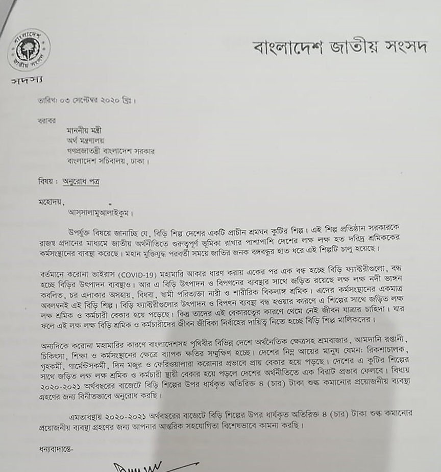 10 Members of Parliament (MPs) have sent a letter addressed to the Finance Minister, calling for a tax-cut on the bidi. Such an act by the MPs is strange to say the least, since the national budget for 2020-21 was passed with their assent. The most important concern to consider here is that there has been no increase in the taxes on bidi in the 2020-21 national budget. Moreover, the taxes on bidi have been remained unchanged for the last four consecutive fiscal years. In this context, such move of the esteemed MPs, motivated by bidi industry’s relentless persuasion, is quite unprecedented and is in grave conflict with the vision of a tobacco-free Bangladesh by 2040, declared by the Honorable Prime Minister. The bidi industry of Bangladesh has been enjoying a significant number of benefits by promoting itself as a vanguard of Bangladesh’s domestic industrialization in front of the policymakers. In the letter addressed to the Finance Minister, the MPs have expressed concern that due to the ongoing pandemic, hundreds of thousands of bidi industry workers are going to lose their livelihoods, a statement utterly devoid of truth. In a 2019 report titled The Revenue and Employment Outcome of Bidi Taxation in Bangladesh by the National Board of Revenue (NBR), it was found that the total number of full-time equivalent bidi workers, including regular, part-time and contractual workers, stands at 46,916. The report also mentioned that 78.6 percent of the bidi workers would give up working for this harmful industry if the government takes measures for rehabilitation into other livelihoods. While the World Health Organization (WHO) has been warning that tobacco increases the risk of Covid-19 infection and subsequent grave illness, these MPs have used the pandemic as a pretext to call for unjustified benefit for an inhumane industry. The policymakers need to avoid such traps set by the bidi factory owners and engage all resources and cooperation to realize the Honorable Prime Minister’s vision of tobacco-free country by 2040.