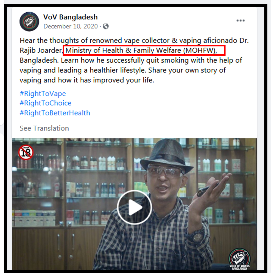 2. VoV Bangladesh is a Facebook page that has been spreading rumors targeting the youth to start vaping. The page has previously claimed that "Vaping could be the answer to avoid cancer", "WHO Europe Office has endorsed vaping", "Vaping keeps the lungs unharmed", and so on. A govt. official endorsing vaping in a platform that has been working as a rumor-machine is a worrying trend and will have far-reaching consequences if not addressed immediately”.