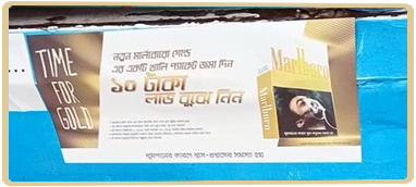 মৃত্যু বিপণন-২ফিলিপ মরিস এর পোষ্টার ক্যাম্পেইন! “TIME FOR GOLD- নতুন মার্লবোরো গোল্ড এর একটি খালি প্যাকেট জমা দিন, ১০ টাকা লাভ বুঝে নিন” লেখা সম্বলিত আকর্ষণীয় পোস্টার দোকানে দোকানে লাগিয়ে রেখেছে ফিলিপ মরিস। ধূমপান ও তামাকজাত ...বিস্তারিত |