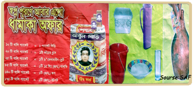 মৃত্যু বিপণন-২বিড়ি খেলে উপহার মেলে! আবুল বিড়ি কিনে খালি মোড়ক জমা দিলেই মিলছে নানা রকম উপহার। উপহারের ছবি এবং শর্ত সম্বলিত পোস্টার চোখে পড়ছে বিভিন্ন এলাকায়। মূলত বিড়ির ...বিস্তারিত |