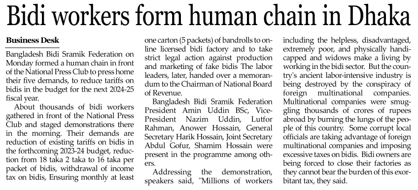 Tobacco companies have been in an overdrive throughout 2024 in a mission to thwart strengthening of tobacco control law and disrupt any attempt of tobacco taxation. British American Tobacco Bangladesh (BATB) and Japan Tobacco International (JTI) sent letters addressed to the Honorable Advisors of the Ministry of Finance and the Ministry of Law, Justice and Parliamentary Affairs opposing the amendment attempt of the tobacco control law. Global Action to End Smoking (GAES), a Philip Morris International (PMI) funded entity, has been conducting a number of programs through Bangladesh Blind Mission which are aimed at eliminating proposals to ban e-cigarettes and vaping products. A non-government organization, Policy Exchange Bangladesh has also arranged a roundtable in partnership with a national daily which was participated by a number of so-called experts closely associated with PMI. Voice of Vapers, which is the official partner of BAT-funded World Vapers' Alliance, has been found active in organizing press conferences, human chains, publishing reports at national dailies and conducting Facebook campaigns throughout the year. Following the latest announcement from the Ministry of Commerce which has incorporated vaping and e-cigarettes in the list of prohibited items in the Import Policy, Bangladesh Electronic Nicotine Delivery System Traders Association (BENDSTA) has expressed its utter discontent with such a decision. Tobacco companies have also opposed the government. decision to incorporate cigarette filters as single-use plastic (SUP). Tobacco industry representatives have also met the Chairman, National Board of Revenue (NBR) during its pre-budget meeting. The companies have also organized human chains and submitted memorandum raising demand for tax advantage. It should be noted that tobacco leaves a devastating impact on public health, environment and economy. Tobacco claims 161,000 lives each year in Bangladesh. However, despite such detrimental effects, investment of tobacco products seemingly has no end. Only a strong tobacco control law and robust tax measures can safeguard the nation from the deadly embrace of tobacco. We hope that the government will free itself from constant interference of the tobacco industry, finalize the draft amendment proposal and implement a robust tobacco tax measure. |
